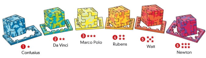 Pudełko zawiera 6 kostek, o 6 poziomach trudności, każda w innym kolorze.